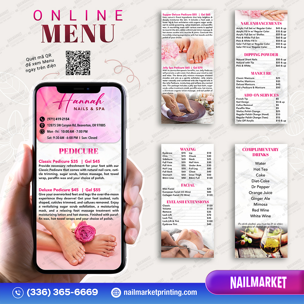 Tiệm nails của bạn xứng đáng tỏa sáng. Hãy cùng ngắm bộ ấn phẩm Grand Opening mà NailMarket đã thực hiện cho Hannah Nails & Spa – tất cả đều được thiết kế với tông hồng và marble trắng, mang đến vẻ đẹp thanh lịch và hiện đại cho không gian. Nếu bạn muốn mang nét sang trọng này vào tiệm của mình, hãy để chúng tôi hỗ trợ bạn một cách trọn vẹn và tinh tế nhất!