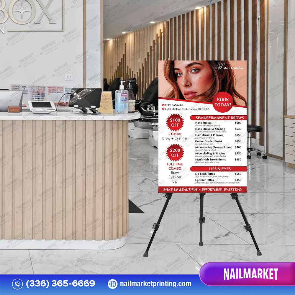 Ngay khoảnh khắc khách bước vào tiệm, Poster Stand lập tức gây ấn tượng, dẫn dắt ánh mắt của họ đến những thông tin ưu đãi, dịch vụ mới hoặc thông điệp quan trọng bạn muốn truyền tải. Đi kèm chân đế nhẹ và dễ di chuyển, cho phép bạn linh hoạt đặt ở bất kỳ vị trí nào trong tiệm để tối đa hiệu quả quảng cáo. Tấm graphic có thể thay đổi mỗi khi có nội dung mới – lý tưởng để thúc đẩy doanh thu cho tiệm nail suốt cả năm.
