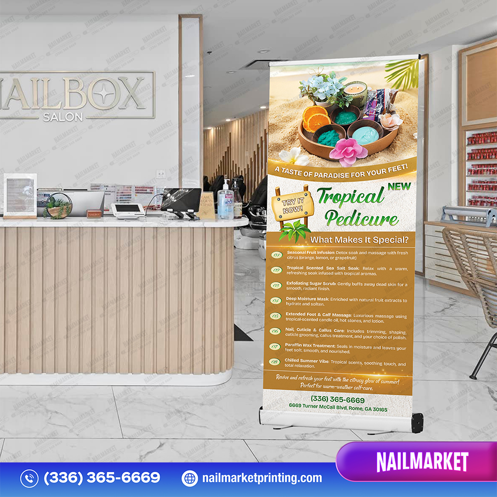 A Retractable Banner is a must-have for any nail salon looking to elevate its brand and drive more revenue. It’s perfect for showcasing new services, high-profit offerings, or special promotions. Each banner comes with a stand that sets up in seconds and rolls neatly into its complimentary carrying case, making it easy to use in your salon or take to fairs, expos, and other events.